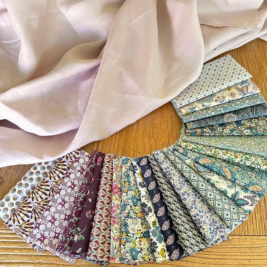 A curated collection of 44 Fat Sixteenths of Liberty Tana Lawn from both the Classic and Organic collection - evenly spread between 2 palettes in shades of - purple/grey/green and teal and - yellow/gold and mustard