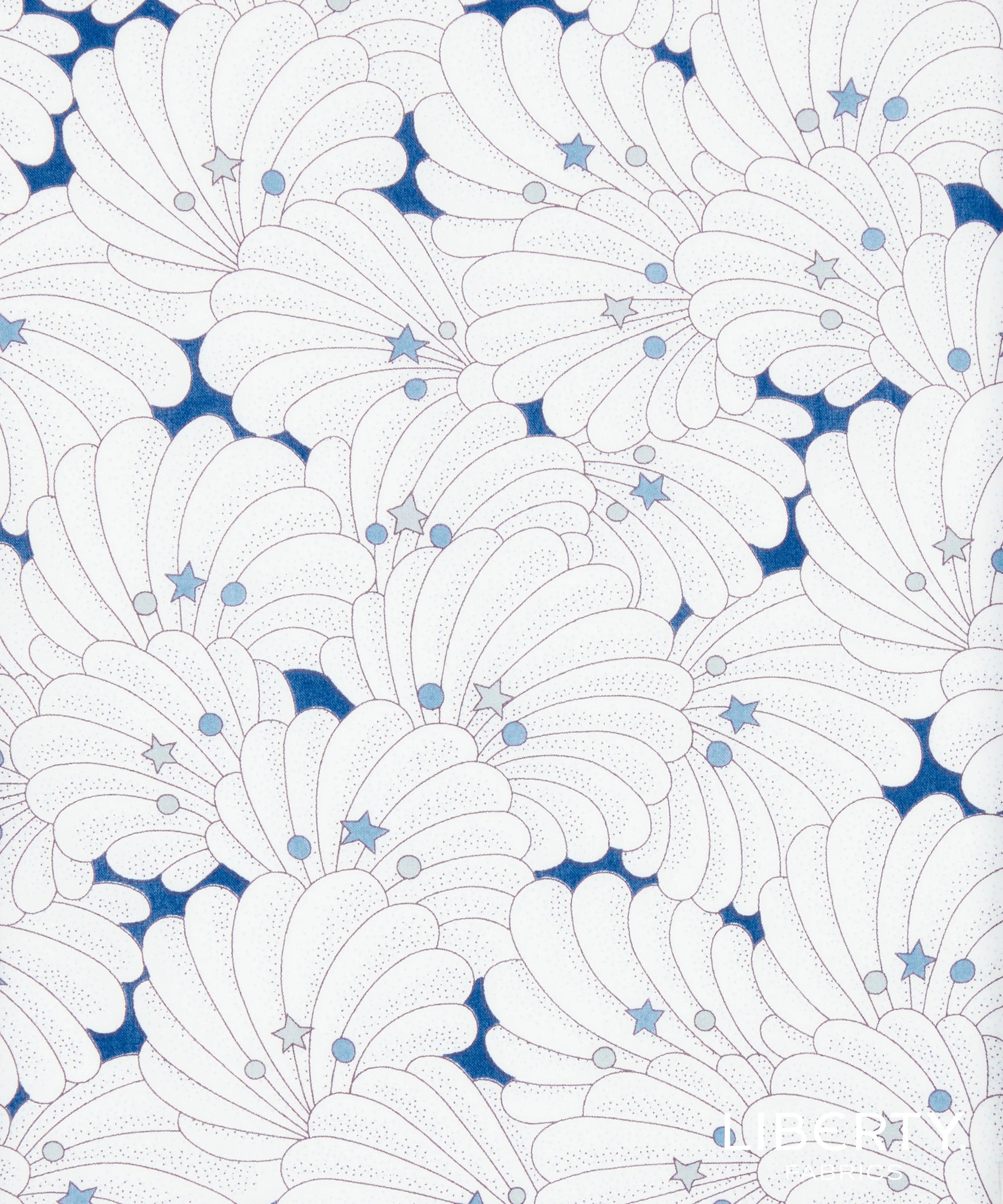 Created and printed by Liberty in 1979, Poiret Shell is a charming conversational featuring cloud-shaped seashells adorned with tiny bundles of spots and stars, representing the fanciful illustrations of artist Raoul Dufy.
